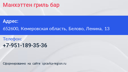 Манхэттен, гриль-бар по адресу 652600, Кемеровская область, Белово, Ленина, 13 в дальнейшем Организация, размещена в следующих категориях:
