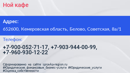 Ной, кафе по адресу 652600, Кемеровская область, Белово, Советская, 8а/1 в дальнейшем Организация, размещена в следующих категориях:
