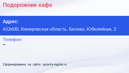 Подорожник, кафе по адресу 652600, Кемеровская область, Белово, Юбилейная, 2 в дальнейшем Организация, размещена в следующих категориях: