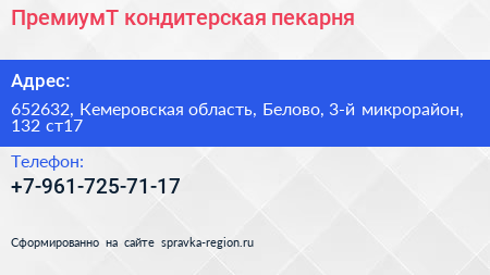 ПремиумТ, кондитерская-пекарня по адресу 652632, Кемеровская область, Белово, 3-й микрорайон, 132 ст17 в дальнейшем Организация, размещена в следующих категориях: