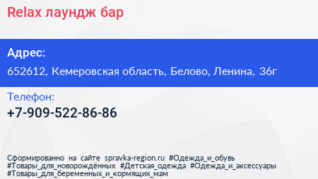Relax, лаундж-бар по адресу 652612, Кемеровская область, Белово, Ленина, 36г в дальнейшем Организация, размещена в следующих категориях: