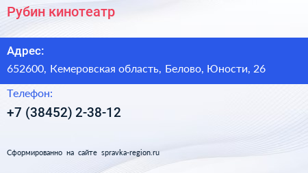 Рубин, кинотеатр по адресу 652600, Кемеровская область, Белово, Юности, 26 в дальнейшем Организация, размещена в следующих категориях: