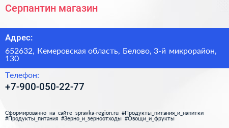 Серпантин, магазин по адресу 652632, Кемеровская область, Белово, 3-й микрорайон, 130 в дальнейшем Организация, размещена в следующих категориях: