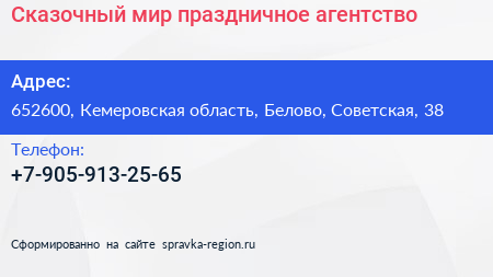 Сказочный мир, праздничное агентство по адресу 652600, Кемеровская область, Белово, Советская, 38 в дальнейшем Организация, размещена в следующих категориях: