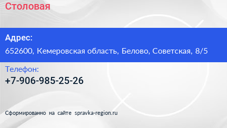 Столовая по адресу 652600, Кемеровская область, Белово, Советская, 8/5 в дальнейшем Организация, размещена в следующих категориях: