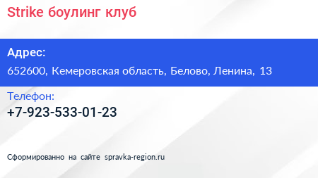 Strike, боулинг-клуб по адресу 652600, Кемеровская область, Белово, Ленина, 13 в дальнейшем Организация, размещена в следующих категориях: