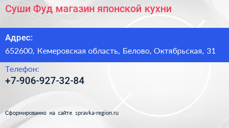 Суши Фуд, магазин японской кухни по адресу 652600, Кемеровская область, Белово, Октябрьская, 31 в дальнейшем Организация, размещена в следующих категориях: