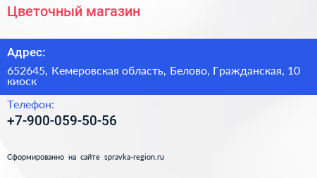 Цветочный магазин по адресу 652645, Кемеровская область, Белово, Гражданская, 10 киоск в дальнейшем Организация, размещена в следующих категориях: