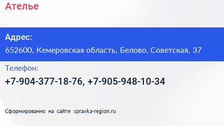 Ателье по адресу 652600, Кемеровская область, Белово, Советская, 37 в дальнейшем Организация, размещена в следующих категориях: