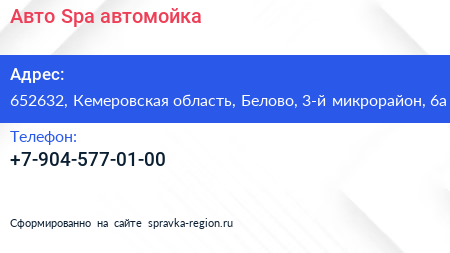 Авто-Spa, автомойка по адресу 652632, Кемеровская область, Белово, 3-й микрорайон, 6а в дальнейшем Организация, размещена в следующих категориях: