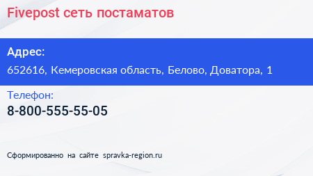 Fivepost, сеть постаматов по адресу 652616, Кемеровская область, Белово, Доватора, 1 в дальнейшем Организация, размещена в следующих категориях: