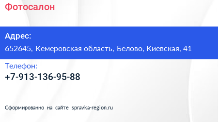 Фотосалон по адресу 652645, Кемеровская область, Белово, Киевская, 41 в дальнейшем Организация, размещена в следующих категориях: