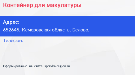 Контейнер для макулатуры по адресу 652645, Кемеровская область, Белово, в дальнейшем Организация, размещена в следующих категориях: