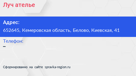Луч, ателье по адресу 652645, Кемеровская область, Белово, Киевская, 41 в дальнейшем Организация, размещена в следующих категориях:
