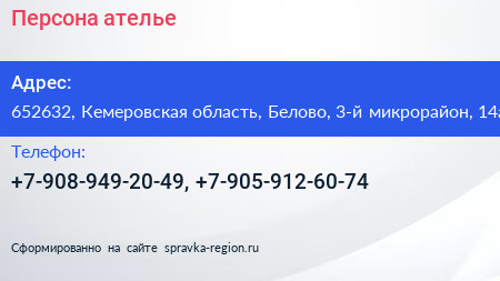 Персона, ателье по адресу 652632, Кемеровская область, Белово, 3-й микрорайон, 14а в дальнейшем Организация, размещена в следующих категориях: