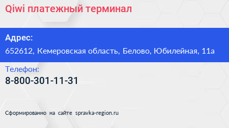 Qiwi, платежный терминал по адресу 652612, Кемеровская область, Белово, Юбилейная, 11а в дальнейшем Организация, размещена в следующих категориях: