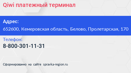 Qiwi, платежный терминал по адресу 652600, Кемеровская область, Белово, Пролетарская, 170 в дальнейшем Организация, размещена в следующих категориях: