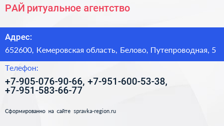 РАЙ, ритуальное агентство по адресу 652600, Кемеровская область, Белово, Путепроводная, 5 в дальнейшем Организация, размещена в следующих категориях: