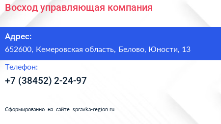 Восход, управляющая компания по адресу 652600, Кемеровская область, Белово, Юности, 13 в дальнейшем Организация, размещена в следующих категориях: