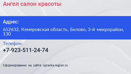 Ангел, салон красоты по адресу 652632, Кемеровская область, Белово, 3-й микрорайон, 130 в дальнейшем Организация, размещена в следующих категориях: