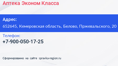 Аптека Эконом Класса по адресу 652645, Кемеровская область, Белово, Пржевальского, 20 в дальнейшем Организация, размещена в следующих категориях: