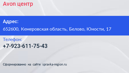 Avon, центр по адресу 652600, Кемеровская область, Белово, Юности, 17 в дальнейшем Организация, размещена в следующих категориях: