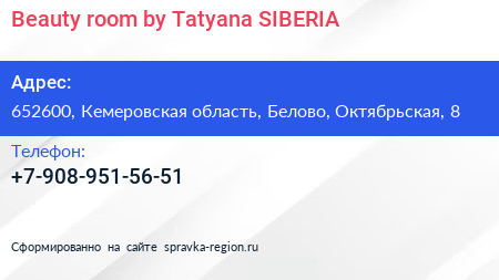 Beauty room by Tatyana SIBERIA по адресу 652600, Кемеровская область, Белово, Октябрьская, 8 в дальнейшем Организация, размещена в следующих категориях: