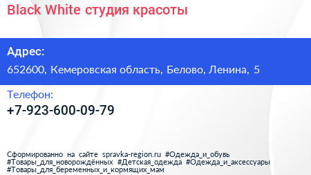 Black & White, студия красоты по адресу 652600, Кемеровская область, Белово, Ленина, 5 в дальнейшем Организация, размещена в следующих категориях: