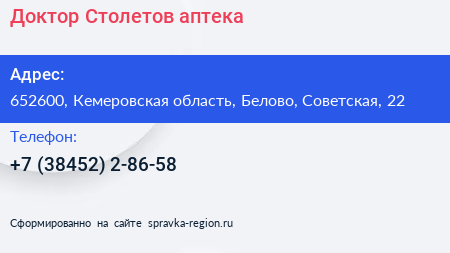 Доктор Столетов, аптека по адресу 652600, Кемеровская область, Белово, Советская, 22 в дальнейшем Организация, размещена в следующих категориях: