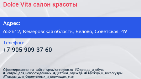 Dolce Vita, салон красоты по адресу 652612, Кемеровская область, Белово, Советская, 49 в дальнейшем Организация, размещена в следующих категориях: