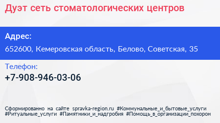 Дуэт, сеть стоматологических центров по адресу 652600, Кемеровская область, Белово, Советская, 35 в дальнейшем Организация, размещена в следующих категориях: