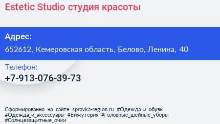 Estetic Studio, студия красоты по адресу 652612, Кемеровская область, Белово, Ленина, 40 в дальнейшем Организация, размещена в следующих категориях: