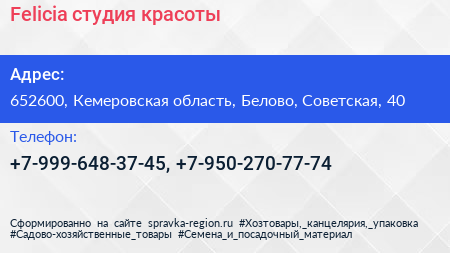 Felicia, студия красоты по адресу 652600, Кемеровская область, Белово, Советская, 40 в дальнейшем Организация, размещена в следующих категориях:
