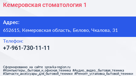 Кемеровская стоматология №1 по адресу 652615, Кемеровская область, Белово, Чкалова, 31 в дальнейшем Организация, размещена в следующих категориях: