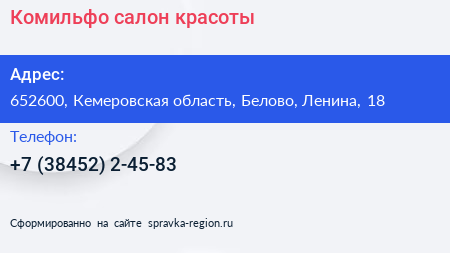 Комильфо, салон красоты по адресу 652600, Кемеровская область, Белово, Ленина, 18 в дальнейшем Организация, размещена в следующих категориях: