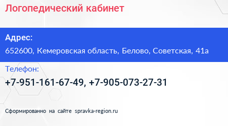 Логопедический кабинет по адресу 652600, Кемеровская область, Белово, Советская, 41а в дальнейшем Организация, размещена в следующих категориях: