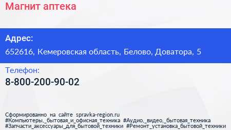 Магнит, аптека по адресу 652616, Кемеровская область, Белово, Доватора, 5 в дальнейшем Организация, размещена в следующих категориях: