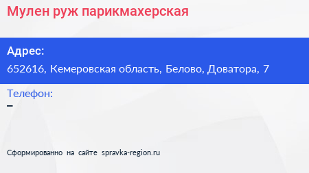 Мулен руж, парикмахерская по адресу 652616, Кемеровская область, Белово, Доватора, 7 в дальнейшем Организация, размещена в следующих категориях: