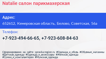 Natalie, салон-парикмахерская по адресу 652612, Кемеровская область, Белово, Советская, 56а в дальнейшем Организация, размещена в следующих категориях:
