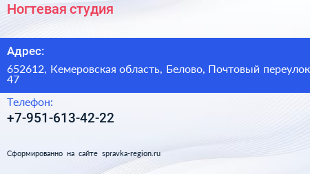 Ногтевая студия по адресу 652612, Кемеровская область, Белово, Почтовый переулок, 47 в дальнейшем Организация, размещена в следующих категориях: