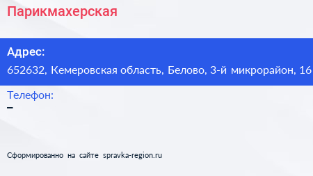 Парикмахерская по адресу 652632, Кемеровская область, Белово, 3-й микрорайон, 16 в дальнейшем Организация, размещена в следующих категориях: