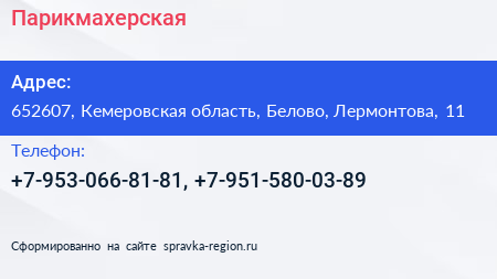 Парикмахерская по адресу 652607, Кемеровская область, Белово, Лермонтова, 11 в дальнейшем Организация, размещена в следующих категориях: