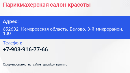 Парикмахерская, салон красоты по адресу 652632, Кемеровская область, Белово, 3-й микрорайон, 130 в дальнейшем Организация, размещена в следующих категориях: