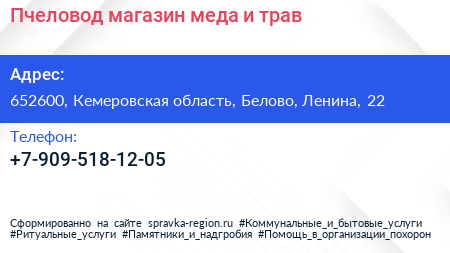 Пчеловод, магазин меда и трав по адресу 652600, Кемеровская область, Белово, Ленина, 22 в дальнейшем Организация, размещена в следующих категориях: