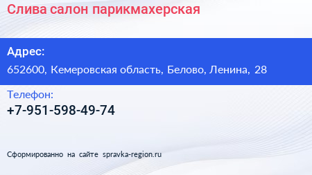 Слива, салон-парикмахерская по адресу 652600, Кемеровская область, Белово, Ленина, 28 в дальнейшем Организация, размещена в следующих категориях: