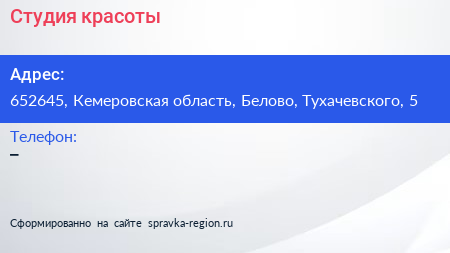Студия красоты по адресу 652645, Кемеровская область, Белово, Тухачевского, 5 в дальнейшем Организация, размещена в следующих категориях: