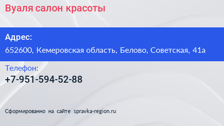 Вуаля, салон красоты по адресу 652600, Кемеровская область, Белово, Советская, 41а в дальнейшем Организация, размещена в следующих категориях: