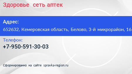 Здоровье+, сеть аптек по адресу 652632, Кемеровская область, Белово, 3-й микрорайон, 16 в дальнейшем Организация, размещена в следующих категориях: