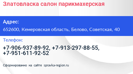 Златовласка, салон-парикмахерская по адресу 652600, Кемеровская область, Белово, Советская, 40 в дальнейшем Организация, размещена в следующих категориях:
