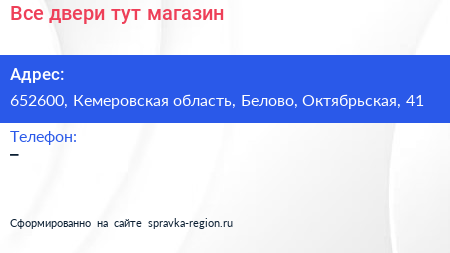 Все двери тут, магазин по адресу 652600, Кемеровская область, Белово, Октябрьская, 41 в дальнейшем Организация, размещена в следующих категориях: